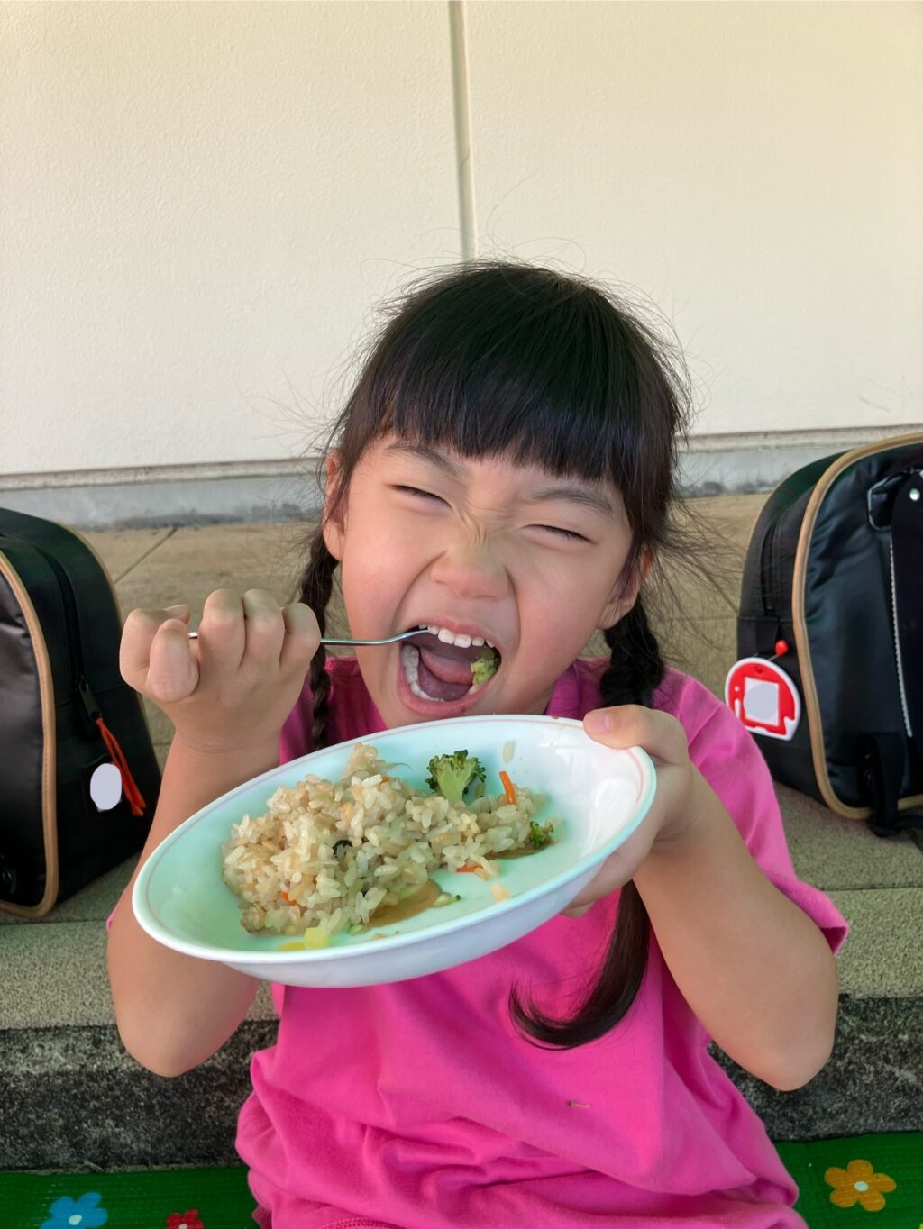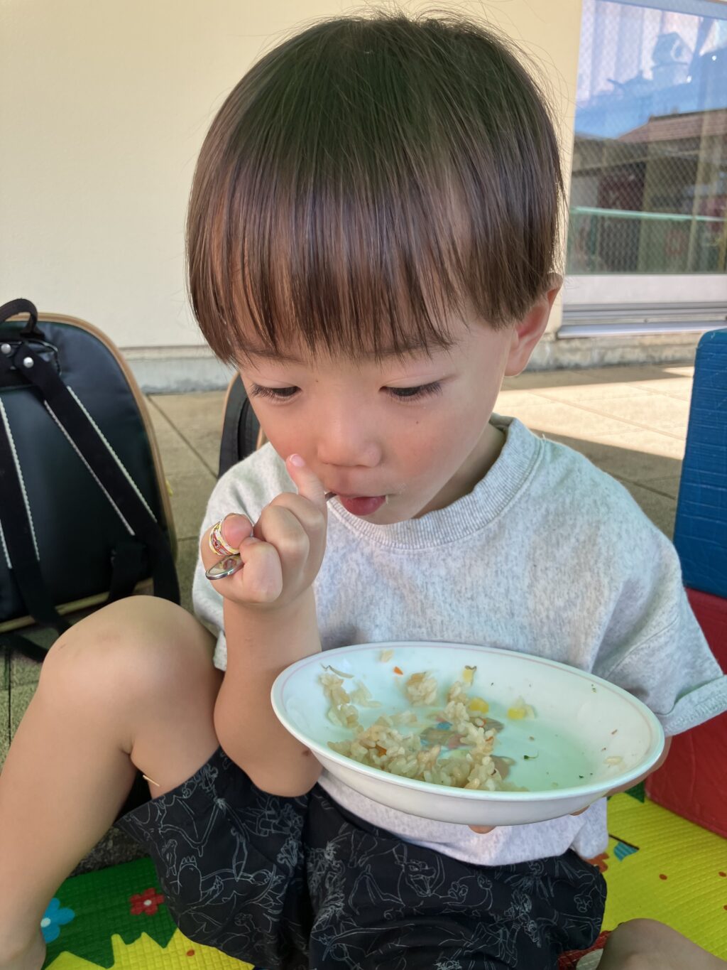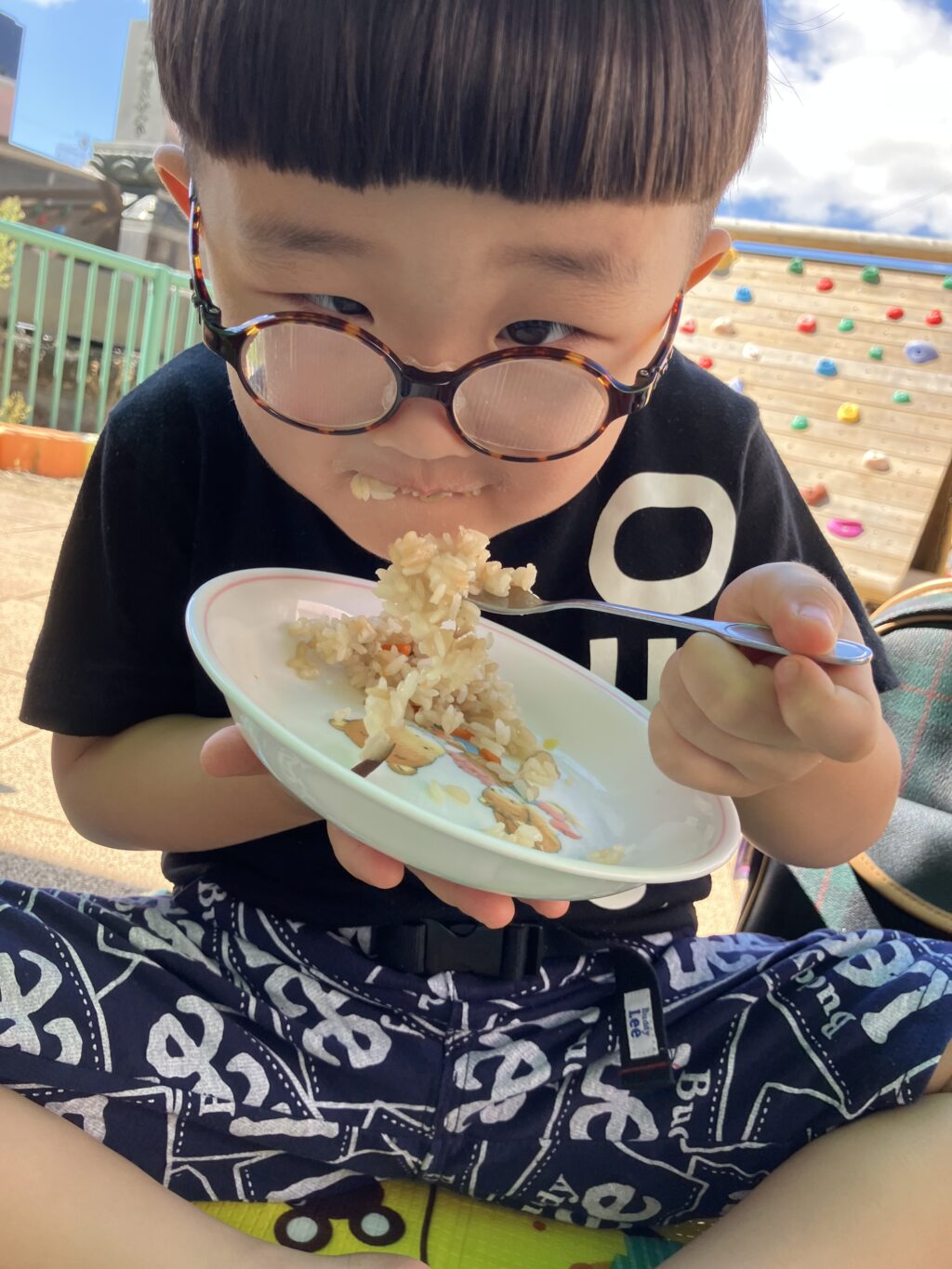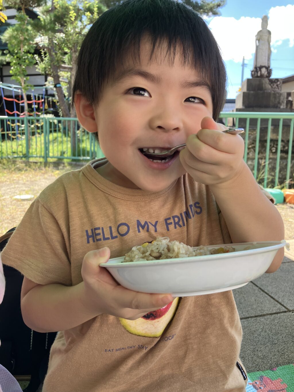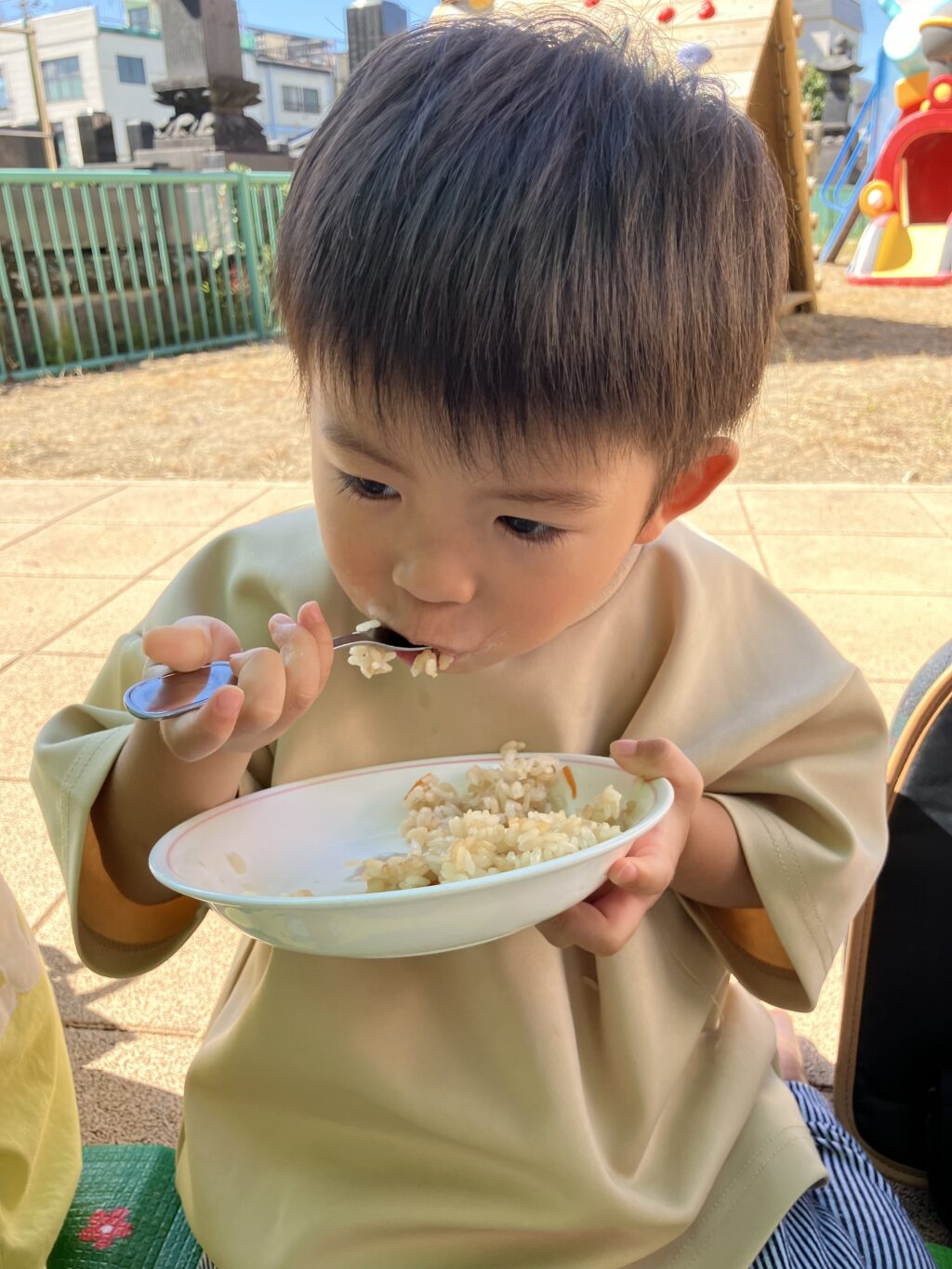 秋晴れの下、テラスで栗ごはんやいものこ汁など秋の味覚を楽しみました🌰🍚