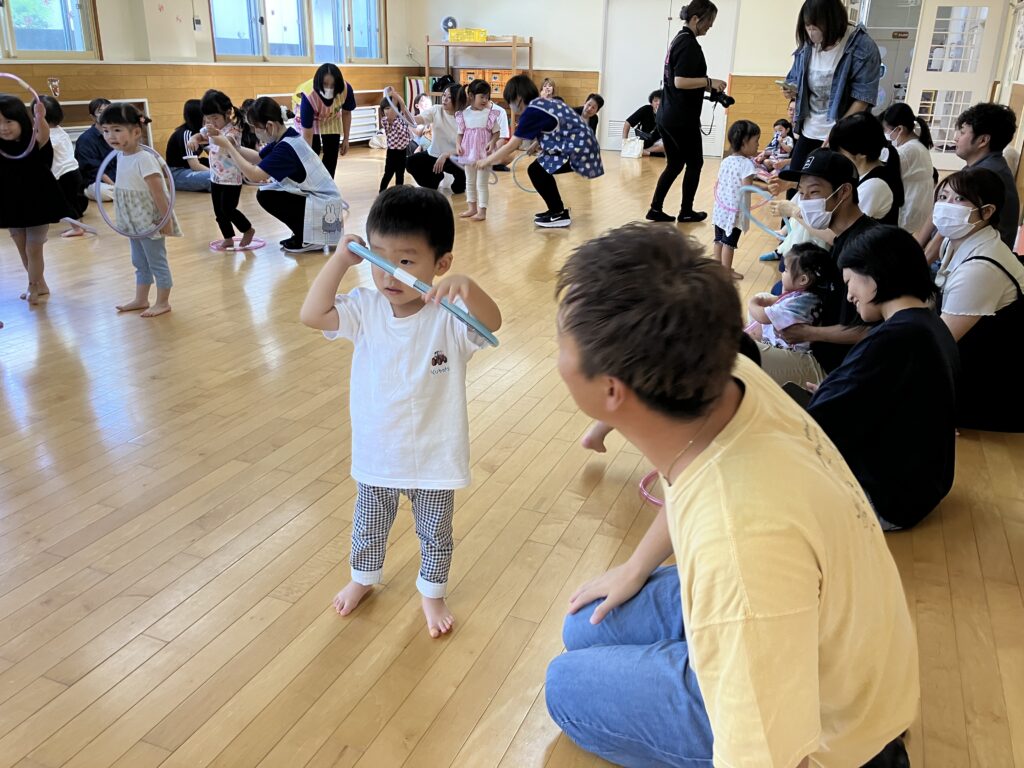フラフープを持ち、リズムに合わせて「シュッシュッポッポ🚃」運転手さんにもなりきりました!