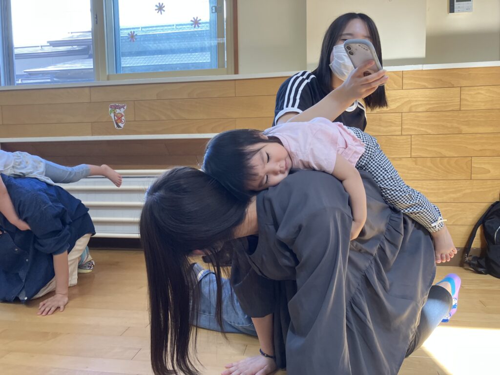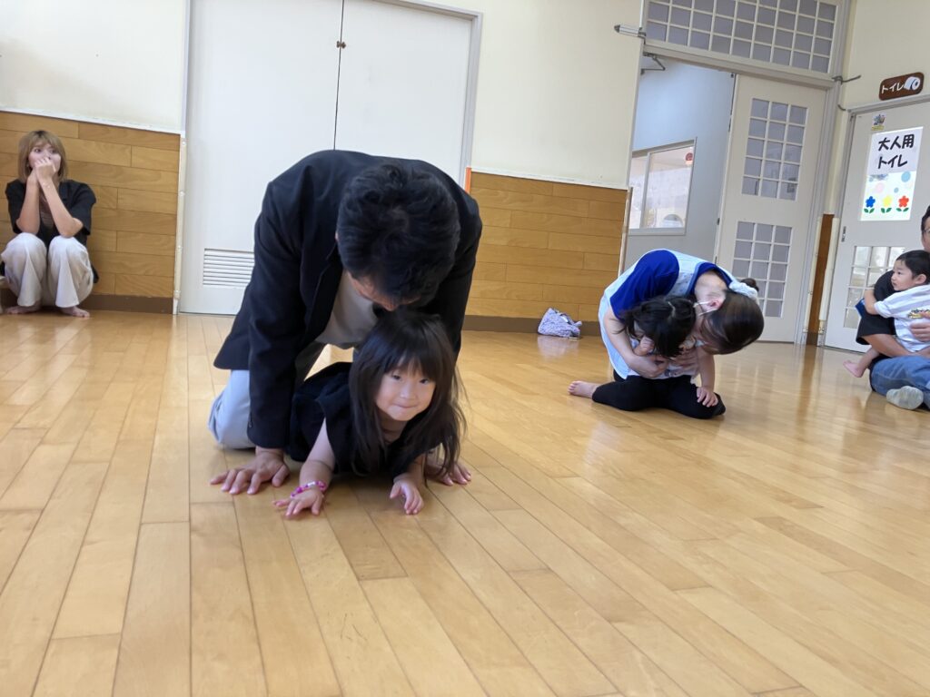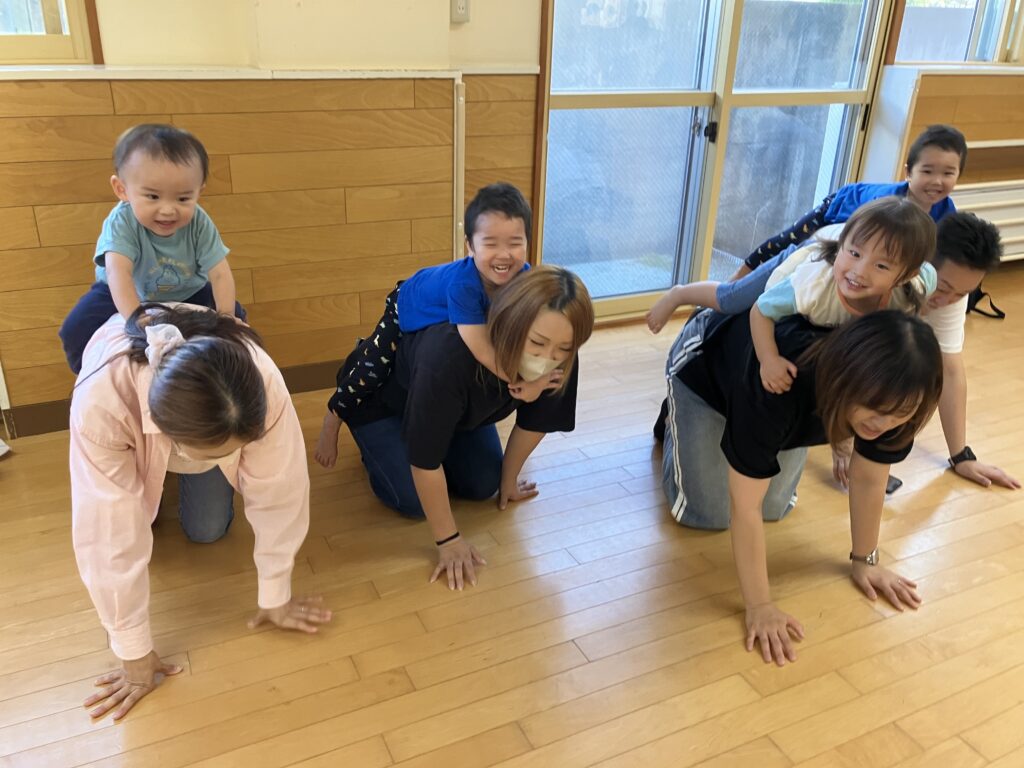 お家の方の背中に乗ってお馬さんに乗った雰囲気を楽しんだり🐎、亀になってホールを回ってみたり…🐢