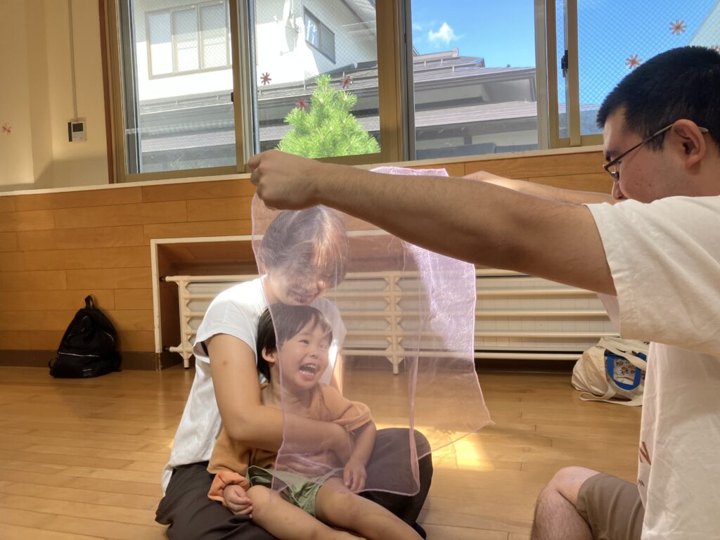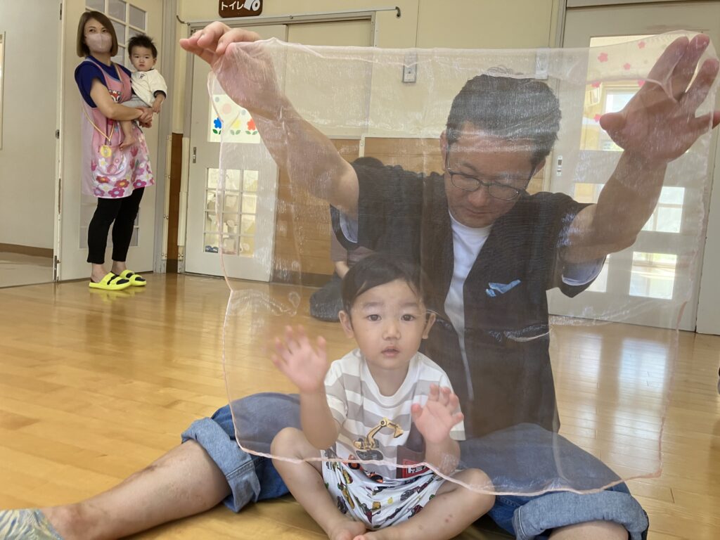 時計の針が動くように「ゴーンゴーン⏱」「チクタクチクタク」と、左右や前後に揺れて楽しそうですね😄  ガーゼを顔にかけて「いないいないばあ!」